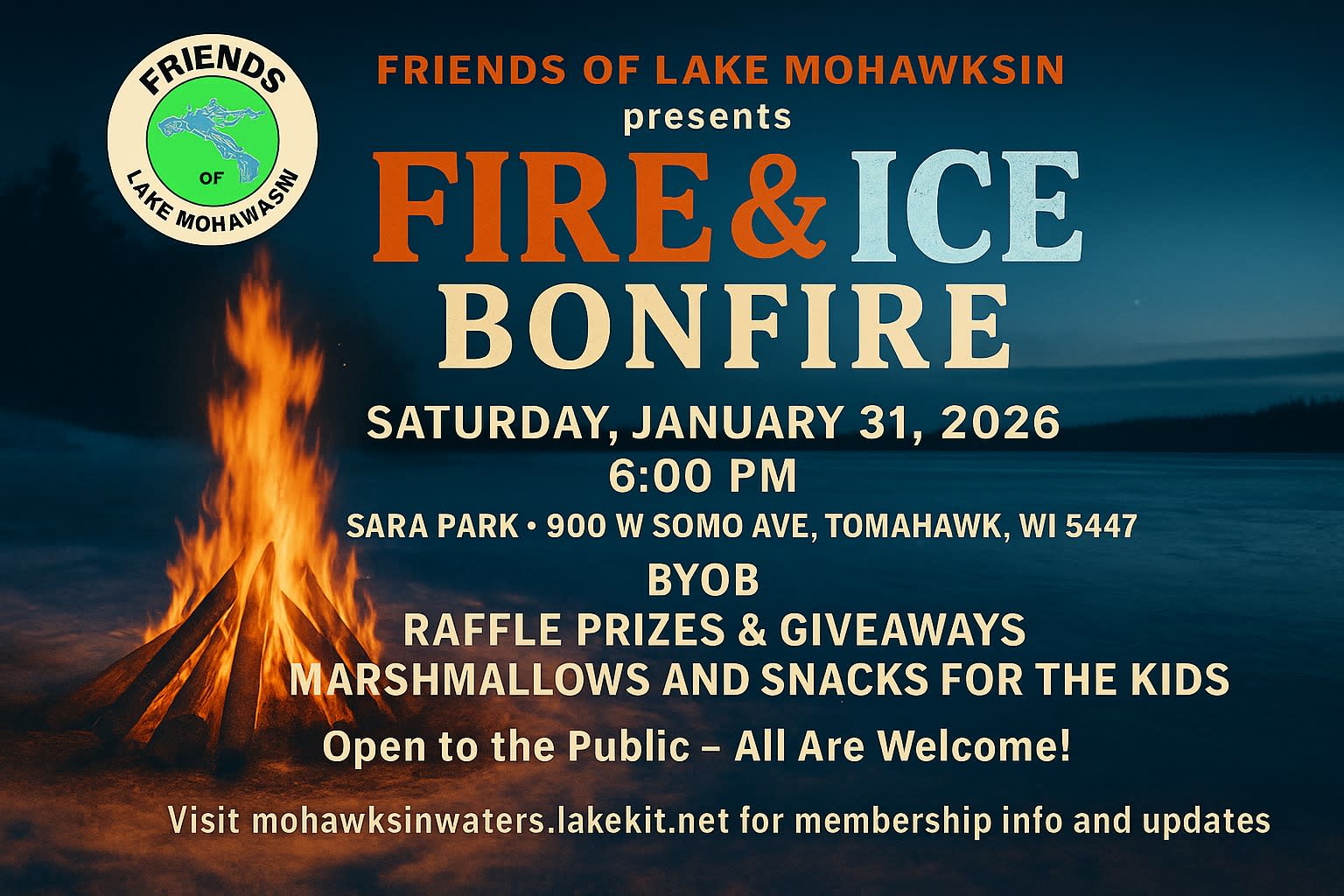 Join us for the 3rd Annual Fire & Ice Bonfire presented by Friends of Lake Mohawksin! Meet us at SARA Park for family and low sensory friendly fun, lots of chances to win, and of course a HUGE bonfire! Easily accessed by car and snowmobile! This event is open-to-all, members or not! The fun starts at 6PM Cash 50/50 Drawing Raffles Prizes Marshmallow Roasting Free snacks for kids B-Y-O-B